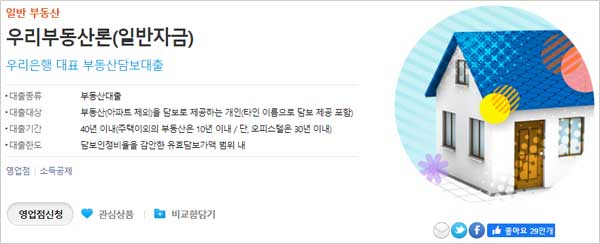 우리은행 부동산담보대출 한도 금액, 우리부동산론(일반자금) 금리 이자, 신청대상 주택 상가 오피스텔 나대지 자격조건, 중도상환수수료, 서류, 담보, 기간 등 보다 자세한 내용은 영업점 직원 또는 우리은행 고객센터(1599-5000 또는 1588-5000)에 문의하시거나 우리은행 홈페이지 부동산 담보대출 카테고리 내 우리부동산론(일반자금) 항목을 통해 확인 할 수 있다고 합니다. 우리은행 부동산담보대출 관련 내용 참고하셨으면 좋겠습니다.