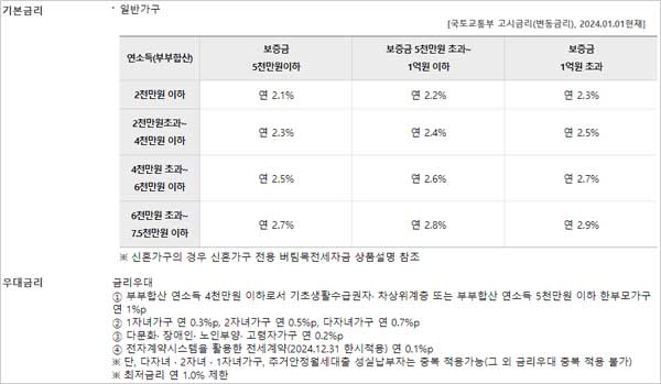 - 본인 및 배우자의 합산 자산이 3.45억원 기준으로 초과된 금액이 1천만원 이내인 경우 신규취급된 금리에 연 0.1%p 가산하며, 1천만원 초과시 신규취급된 금리에 연2.0%p가 가산된다고 합니다.