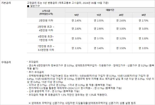 ▶ 우리은행 내집마련 디딤돌대출 금리 이자 이율은 다음과 같다고 합니다. 국토교통부 고시금리 2024년 6월 19일 기준 일반가구 고정금리 또는 5년 변동금리와 우대금리라고 합니다. 생애최초 주택구입 신혼가구는 내집마련 디딤돌대출(생애최초주택구입 신혼가구) 상품설명을 참조하면 된다고 합니다.