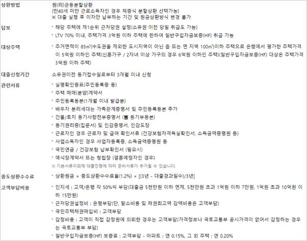 ▶ 대출기간은 10년, 15년, 20년, 30년이고 ▶ 대출신청은 소유권이전 등기접수일로부터 3개월 이내 신청해야 하며 ▶ 상환방법은 원(리)균등분할상환 방식으로 만40세 미만 근로소득자인 경우 체증식 분할상환 선택이 가능하다고 합니다. 다만 대출 실행 후 이자만 납부하는 기간 및 원금상환방식 변경은 불가하다고 합니다.