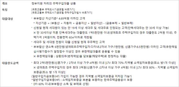 ② 신청일 현재 세대원이 있는 만 19세 이상 세대주 및 세대주로 인정되는 분(단독세대주는 만 30세 이상 가능)이라고 핳ㅂ니다. 다만 만 30세이상 미혼 단독세대주는 대출한도 1억5천만원 이내(생애최초 주택구입자의 경우 대출한도 2억원 이내), 주택가격 3억원이하, 전용면적 60㎡이하로 제한된다고 합니다.