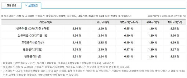 ▶ 우리은행 신차대출 우리드림카대출 금리 이자 이율은 다음과 같다고 합니다. 2024년 6월 25일 현재 대출금액 5천만원이상, 대출기간 36개월, 원리금균등분할상환 방식, 은행내부 신용등급 4등급 기준에 대한 금리라고 합니다.