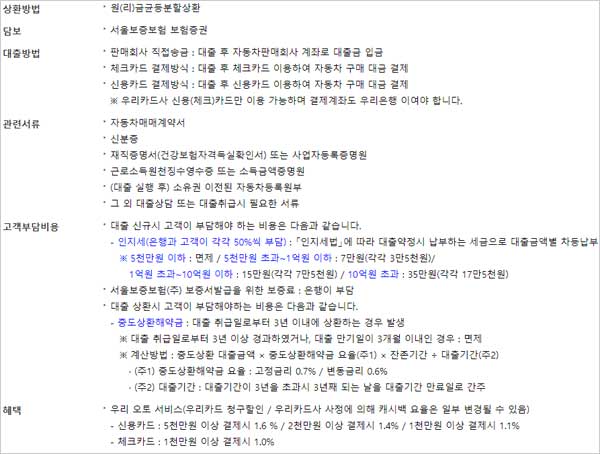 - 신용카드 결제방식 : 대출 후 신용카드를 이용하여 자동차 구매 대금을 결제합니다. 다만 우리카드사 신용(체크)카드만 이용 가능하며 결제계좌도 우리은행이여야 합니다.