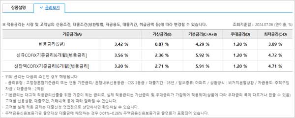 ▶우리은행 아파트담보대출 금리 이자 이율은 2024년 7월 6일 현재 다음과 같으며 금리관련 자세한 사항은 영업점 직원과 상담을 통해 확인이 가능하다고 합니다.