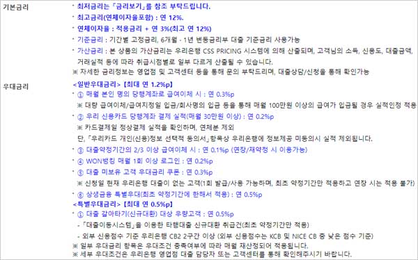 대출한도는 CB구간에 따른 연소득 가중치(70%~120%)가 적용되며 우리은행 및 다른 금융기관의 신용대출 및 보증채무 금액은 한도에서 차감된다고 합니다.