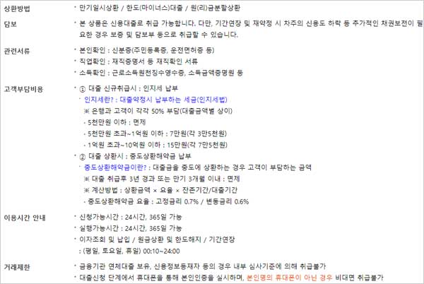 ▶ 상환방법은 만기일시상환 / 한도(마이너스)대출 / 원(리)금분할상환 방식이며 ▶ 담보는 없으며(신용대출)