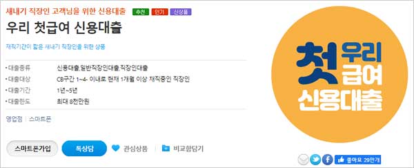 우리은행 직장인 신용대출 우리 첫급여 대출 상품은 우리은행 홈페이지에서 소개하고 있으며 재직기간이 짧은 새내기 직장인을 위한 대출 상품으로서 재직기간 1개월 이상이면 최소 소득조건없이 대출 신청이 가능하다고 합니다.