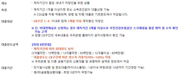 다만 비대면채널로 신청하는 경우 재직기간 3개월 이상으로 국민건강보험공단 스크래핑을 통한 재직 및 소득 확인이 이뤄진다고 합니다. 참고로 우리은행 CB구간의 세부내용은 우리은행 홈페이지 공지사항에서 확인이 가능하다고 합니다.