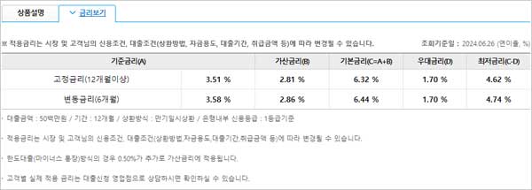 ▶ 우리은행 직장인 신용대출 우리 첫급여 신용대출 금리 이자 이율은 다음과 같다고 합니다. 2024년 6월 26일 기준 대출금액 50백만원, 만기일시상환방식, 대출기간 12개월, 내부 신용등급 1등급 기준이라고 합니다.