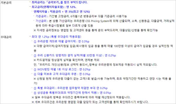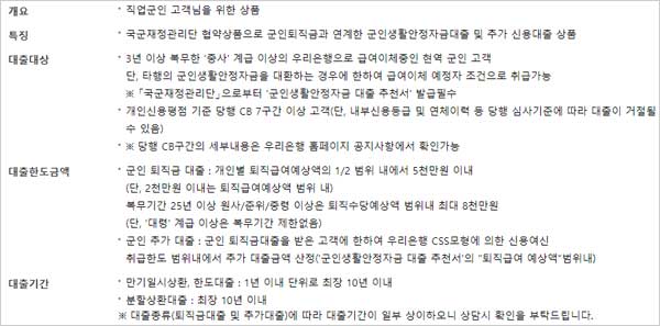 ③ 군인 추가 대출 : 군인 퇴직금대출을 받은 고객에 한하여 우리은행 CSS모형에 의한 신용여신 취급한도 범위내에서 추가 대출 금액을 산정('군인생활안정자금 대출 추천서'의 "퇴직급여 예상액"범위내)한다고 합니다.