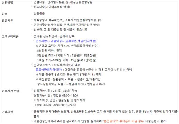 ▶ 상환방법은 건별대출은 만기일시상환, 원(리)금분할상환 방식 및 한도대출(마이너스통장 방식)이며 ▶ 담보는 없으며(신용대출)