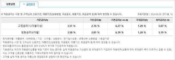▶ 참군인 우대대출 우리은행 직업군인 신용대출 금리 이자 이율은 다음과 같다고 합니다. 2024년 6월 26일 기준 퇴직금 대출, 대출금액 50백만원, 만기일시상환방식, 대출기간 12개월, 내부 신용등급 1등급 기준에 따른 금리라고 합니다.