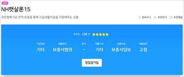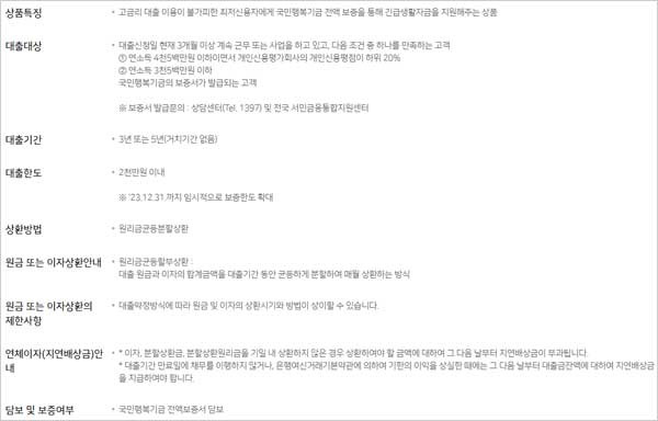 농협은행 홈페이지에서 소개하고 있는 NH농협은행 햇살론15 대출 상품은 고금리 대출 이용이 불가피한 최저신용자에세 국민행복기금 전액 보증을 통해 긴급생활자금을 지원해주는 대출 상품이라고 합니다.