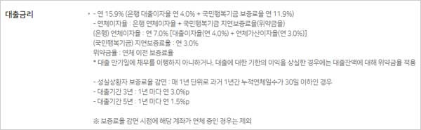 ▶ NH농협 햇살론15 대출 이자 금리 이율은 다음과 같다고 하는데요. 2024년 7월 25일 현재 연 15.9% (은행 대출이자율 연 4.0% + 국민행복기금 보증료율 연 11.9%)라고 해요,.