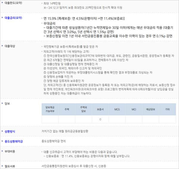 ▶ 중도상환수수료는 없으며 부대비용은 대출 신규취급시 신용보증료가 연 11.4%로 신용보증료는 은행이자와 함께 매월 납부한다고 해요. ▶ 담보는 국민행복기금 보증서이며 ▶ 필요서류는 서민금융통합지원센터 보증심사 후 대출 신청 시 신분증이라고 해요.