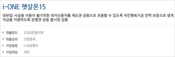 기업은행 햇살론15 대출 자격 신청 대상 조건 및 한도 금액, 금리 이자 이율, 기간, 담보, 중도상환수수료, 상환방법, 대출 유의사항 등 보다 자세한 내용은 IBK고객센터 1588-2588, 1566-2566 또는 기업은행 각 영업점, IBK기업은행 홈페이지→ 금융상품 → 개인상품물 → 개인담보대출 카테고리 내 i-ONE 햇살론15 항목을 통해 확인 할 수 있다고 합니다. 참고하셨으면 좋겠습니다.