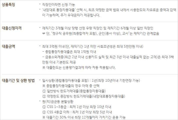 - 국민은행 직장인 신용대출 상품은 '약정한도 증감방식 한도거래대출(내맘대로 통장자동대출)' 선택 시 최초 약정금액 범위 내에서 자유로운 한도조절이 가능한 상품이라고 해요.