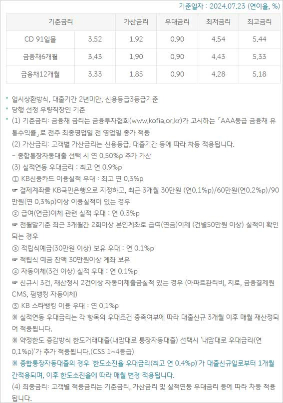 ▶ 국민은행 직장인 신용대출 금리 이자 이율은 다음과 같은데요. 2024년 7월 23일 기준 일시상환방식, 대출기간 2년 미만, 신용등급3등급 기준 금리 현황이며 국민은행 선정 우량직장인 기준에 대한 금리라고 해요.