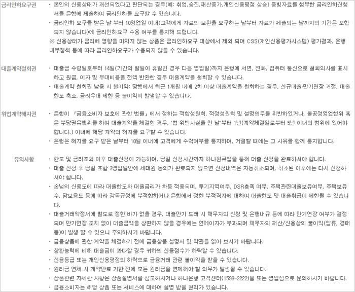- 참고로 하나은행 주택담보대출 상품은 금리인하 요구권 신청 및 대출계약 철회권, 위법계약 해지권 신청이 가능하다고 해요.