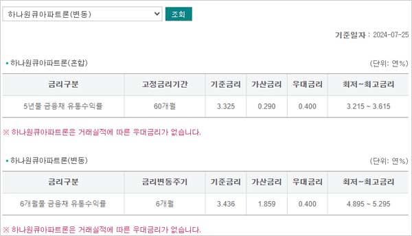 하나원큐 아파트론 대출 금리 이자 이율 및 한도 금액, 신청 대상 주택 자격 조건, 담보, 서류, 중도상환수수료, 기간, 상환방법, 대출 유의사항 등보다 자세한 내용은 상품설명서를 참조하거나, 하나은행 고객센터(1599-2222) 또는 영업점, 하나은행 홈페이지 담보대출 카테고리 내 하나원큐 아파트론 항목을 통해 확인 할 수 있다고 합니다. 참고하셨으면 좋겠습니다.