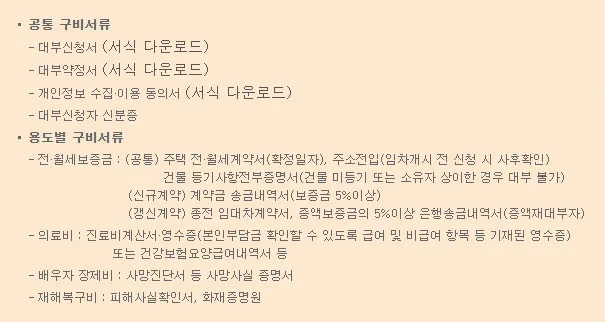 ▷ 배우자 장제비 대출에는 사망진단서 등 사망사실증명서, 장제비영수증 등이 필요하구요. ▷ 재해복구비 대출에는 피해사실확인서 또는 화재증명원 등이 필요하다고 해요. 다만 대출 신청 시 서류보완 및 추가서류 등이 요청될 수 있기 때문에 지사 담당자와 상담 후 신청해야 한다고 해요.