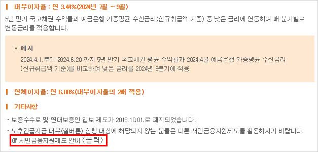 2024.4.1.부터 2024.6.20.까지 5년 만기 국고채권 평균 수익률과 2024년 4월 예금은행 가중평균 수신금리(신규취급액 기준)을 비교하여 낮은 금리를 2024년 3분기에 적용한다고 해요. 참고로 연체 이자율은 연 6.88%로 대부이자율의 2배가 적용된다고 해요.