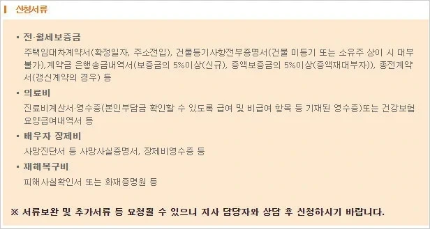 ▷ 배우자 장제비 대출에는 사망진단서 등 사망사실증명서, 장제비영수증 등이 필요하구요. ▷ 재해복구비 대출에는 피해사실확인서 또는 화재증명원 등이 필요하다고 해요. 다만 대출 신청 시 서류보완 및 추가서류 등이 요청될 수 있기 때문에 지사 담당자와 상담 후 신청해야 한다고 해요.