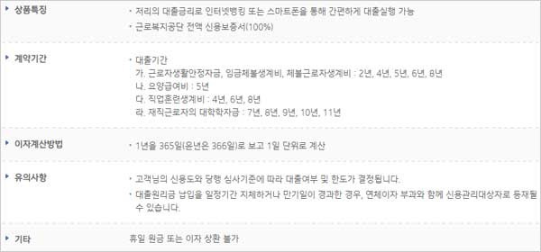 ▶ 담보는 근로복지공단 전액 신용보증서(100%)이라고 합니다. ▶ 필요서류는 재직 및 소득 입증서류, 신분증 등이라고 합니다. ▶참고로 휴일에 원금 또는 이자, 대출금 상환은 불가하다고 합니다.