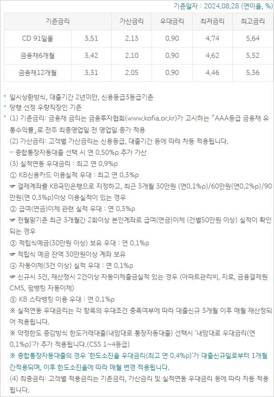 ▶ 국민은행 직장인 신용대출 금리 이자 이율은 다음과 같다고 합니다. 2024년 8월 28일 기준 일시상환방식, 대출기간 2년 미만, 신용등급3등급 기준 금리 현황이며 국민은행 선정 우량직장인 기준에 대한 금리라고 합니다.