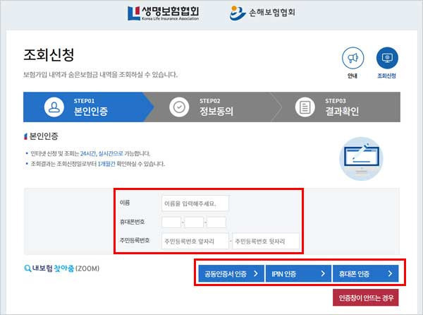 보험가입내역 일괄조회 서비스 사이트 내보험 찾아줌 홈페이지 서비스를 통한 휴면 보험금 조회시 개인정보와 공동인증서 인증, IPIN, 휴대폰 중 하나의 방법을 선택해 인증을 하게 되면 몇번의 클릭만으로 휴면 보험금을 간단하게 확인할 수 있고 지급 받을 수 있다고 해요.