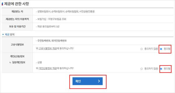 공인인증이 끝나면 개인정보 활용에 관한 동의 화면이 나타나는데요. 모두 체크해야 다음 단계로 진행이 되요. 체크 한 후 확인을 클릭해 주세요.