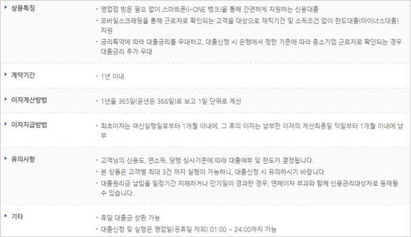 ▶기업은행 중소기업 근로자 우대 신용대출 기간은 1년 이내라고 하며 ▶ 상환방법은 수시상환(마이너스통장 대출)방식으로서 휴일 대출금 상환이 가능하다고 합니다.