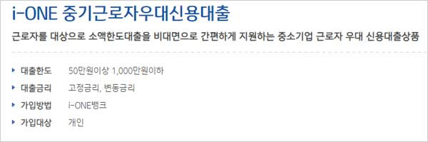 기업은행 중소기업 근로자 우대 신용대출 한도 금액 및 금리 이자 이율, 신청 자격조건, 서류, 중도상환수수료, 기간, 담보, 상환방법, 대출 유의사항 등 보다 자세한 내용은 IBK고객센터 1588-2588, 1566-2566 또는 기업은행 각 영업점, IBK기업은행 홈페이지→ 금융상품 → 개인상품물 → 개인신용대출 카테고리 내 i-ONE 중기근로자우대신용대출 항목을 통해 확인 할 수 있다고 합니다. 관련 내용 참고하셨으면 좋겠습니다.