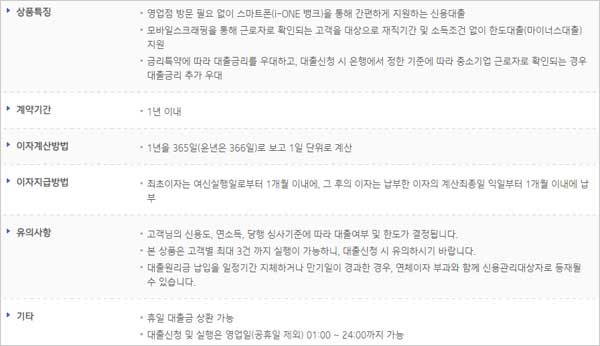 기업은행 소액대출 한도 금액 및 금리 이자 이율, 신청 자격조건, 서류, 중도상환수수료, 기간, 담보, 상환방법, 대출 유의사항 등 보다 자세한 내용은 IBK고객센터 1588-2588, 1566-2566 또는 기업은행 각 영업점, IBK기업은행 홈페이지→ 금융상품 → 개인상품물 → 개인신용대출 카테고리 내 i-ONE 중기근로자우대신용대출 항목을 통해 확인 할 수 있다고 합니다. 참고하셨으면 좋겠습니다.