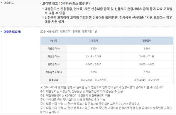 다만 대출한도는 신용등급, 연소득, 기존 신용대출 금액 및 신용카드 현금서비스 금액 등에 따라 다를 수 있으며 신청금액을 포함하여 기업은행 신용대출 50백만원, 전금융권 신용대출 1억원을 초과하는 경우에는 대출이 불가하다고 합니다.