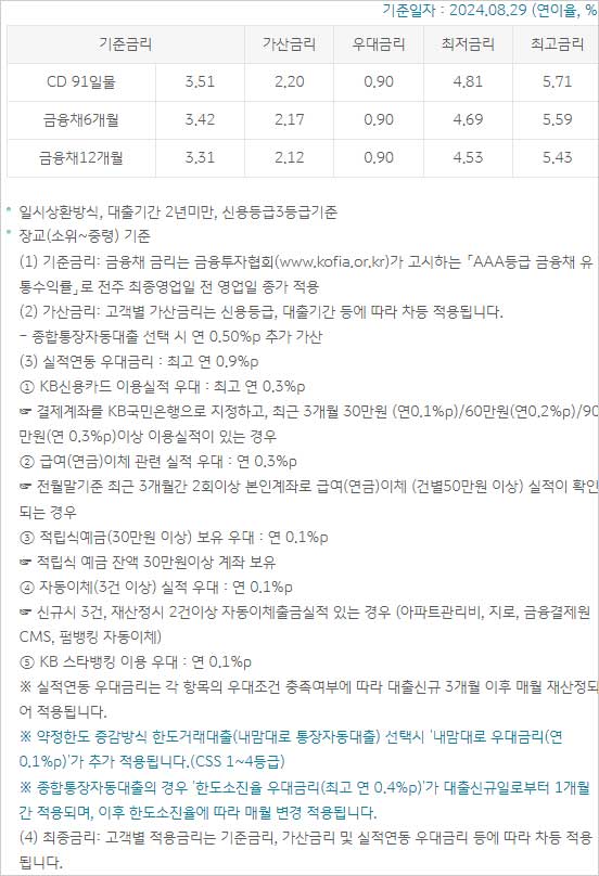 ▶ 국민은행 군인 신용대출 금리 이자 이율은 다음과 같다고 합니다. 2024년 8월 29일 현재 일시상환방식, 대출기간 2년 미만, 신용등급 3등급 기준이라고 합니다.
