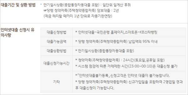 ▶ 대출 기간은 국민은행 청약저축(주택청약종합저축) 담보대출은 2년이라고 합니다. 예금을 해지할 때까지 1년 단위로 자동으로 기한이 연장 된다고 합니다. ▶ 상환방법은 만기일시상환(종합통장자동대출 포함)방식이라고 합니다.