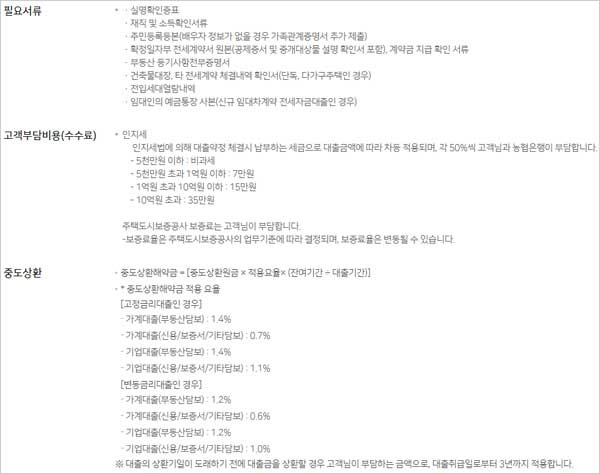 ▶ 대출 기간은 25개월 이내이며 ▶ 상환방법은 만기일시상환방식이라고 합니다. ▶ 담보는 주택도시보증공사 전세자금대출특약보증서(보증비율 100%) 담보라고 합니다.