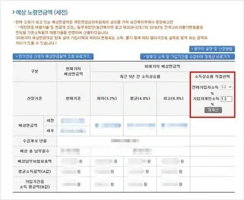 4. 예상수령액은 현재 기준과 최근 5년간 소득상승률에 따라 달라진다고 하는데요. 최저는 3.2%, 평균은 4.1%, 최고는 4.9%라고 해요. 특히 오른쪽 상단에서 본인이 직접 선택해서 비교할 수 있다고 해요.