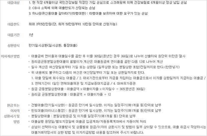 하나은행 직장인 신용대출 상품은 하나은행 홈페이지에서 소개하고 있으며 하나은행 직장인 신용대출 조건은 현 직장 6개월 이상 국민건강보험 직장인 가입을 하신 분으로 스크래핑에 의해 건강보험료를 6개월 이상 정상 납입한 분 및 CB사 소득에 의해 대출한도가 산정되는 분이 대상이 된다고 합니다.