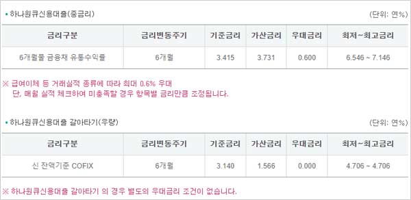 참고로 하나은행 직장인 신용대출 상품은 금리인하 요구권 및 대출계약 철회권, 위법계약 해지권 신청이 가능하며 금리 이자 이율 및 관련내용은 다음과 같다고 합니다.