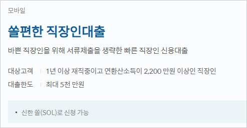 직장인 신한은행 신용대출 상품은 신한은행 홈페이지에서 소개하고 있으며 신청 대상 자격 조건은 1년 이상 재직중이고 연환산소득이 2천2백만원 이상인 직장인이 대상이 된다고 합니다.