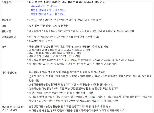 ▶ 중도상환수수료 및 인지세는 없다(5천만원 이하)고 합니다. ▶ 담보(신용취급) 또한 없으며 ▶ 혜택으로는 대출 취급후 성실 거래고객에게는 최대 연 2.0%p 금리 추가 감면 혜택이 있다고 합니다.