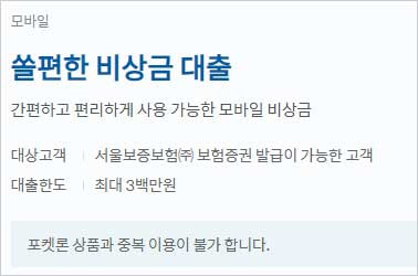 신한은행 쏠편한 비상금대출 상품은 신한은행 홈페지에서 소개하고 있으며 신한은행 쏠편한 비상금대출 신청 대상 자격 조건을 알아보면 서울보증보험 보험증권 발급이 가능한 분, 만19세 이상 내국인, KCB평점 631점 이상, 서울보증보험 개인신용평점(등급) 1~6등급 이내 심사기준을 충족하는 분이라고 합니다.