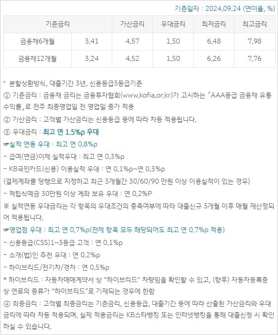 참고로 kb매직카 중고차대출 상품은 금리인하 요구권 및 대출계약 철회권, 위법계약 해지권 신청이 가능한 상품이라고 하며 금리 이자 이율 및 관련내용은 다음과 같다고 합니다.