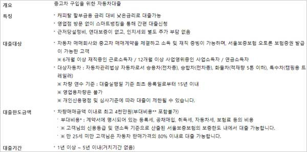 ▶ 대상 차종 자동차는 자동차관리법상 자동차로서 승용차(전차종), 승합차(전차종), 화물차(적재량 5톤 이하), 특수차(캠핑용 트레일러)라고 합니다. 다만 차량 연수 기준은 대출실행일 기준 최초 등록일로부터 15년 이내여야 하며 영업용차량은 개인대출로 취급이 불가하다고 합니다.