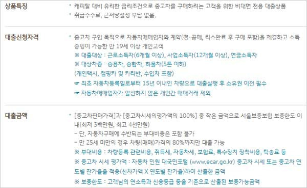 ▶ 국민은행 중고차대출 한도 금액은 중고차판매가격과 중고차시세의 평가액의 100% 중 작은 금액으로 서울보증보험 보증한도 이내(최저 3백만원, 최고 4천만원)라고 합니다.