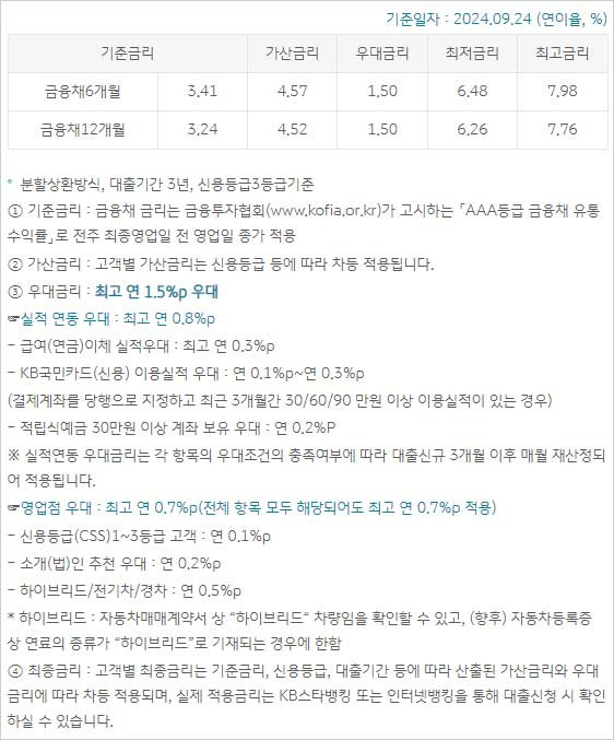 참고로 국민은행 중고차대출 상품은 금리인하 요구권 및 대출계약 철회권, 위법계약 해지권 신청이 가능한 상품이라고 하며 금리 이자 이율 및 관련내용은 다음과 같다고 합니다.