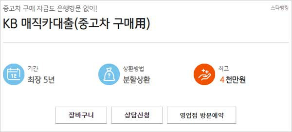 국민은행 중고차대출 한도 금액 및 금리 이자 이율, 신청대상 자격조건, 서류, 중도상환수수료, 담보, 기간, 대출 유의사항 등 보다 자세한 사항은 각 영업점 또는 KB국민은행 고객센터(1588-9999), KB국민은행 홈페이지 자동차대출 카테고리 내 KB 매직카대출(중고차 구매用) 항목을 통해 확인 할 수 있다고 합니다.