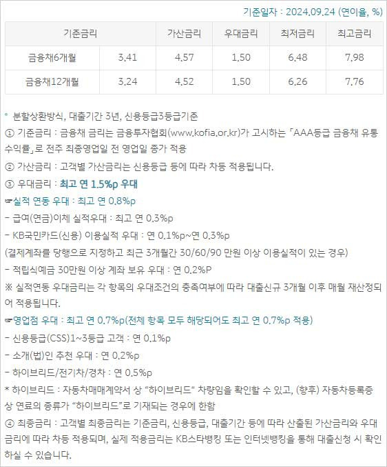 참고로 국민은행 중고자동차 대출 상품은 금리인하 요구권 및 대출계약 철회권, 위법계약 해지권 신청이 가능한 상품이라고 하며 금리 이자 이율 및 관련내용은 다음과 같다고 합니다.